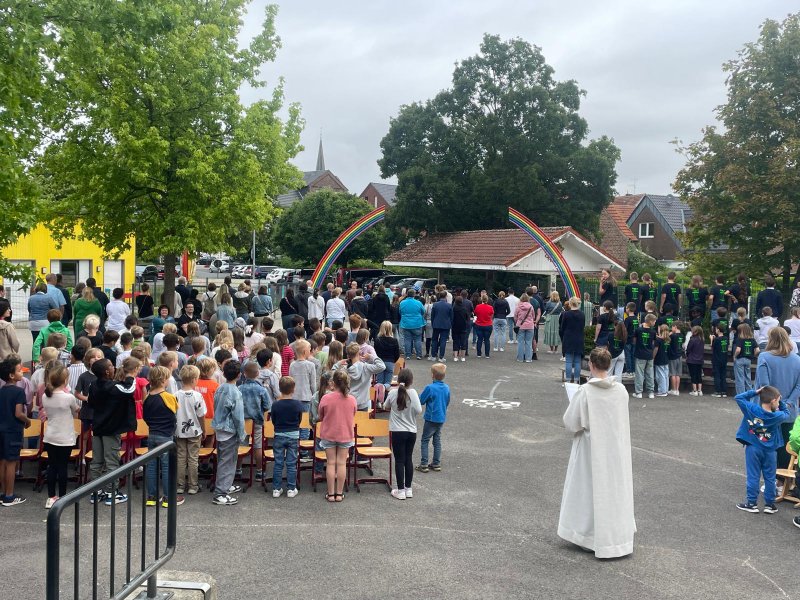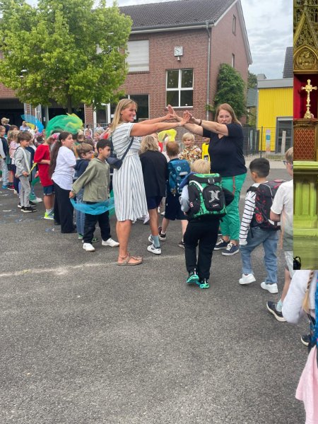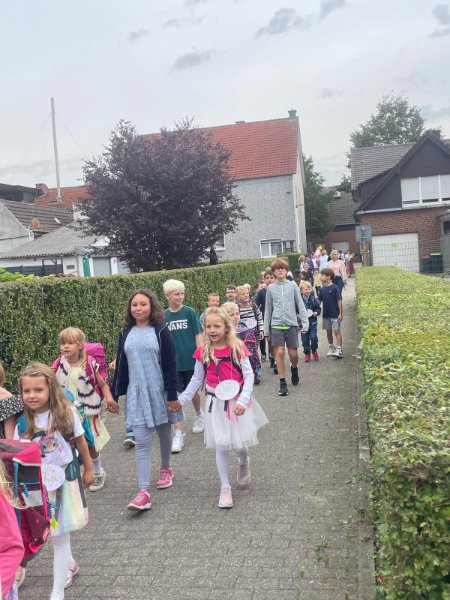 Zu Beginn versammelten sich alle Schülerinnen und Schüler, das gesamte Kollegium sowie zahlreiche Eltern auf dem Schulhof zu einem gemeinsamen Gottesdienst. Unter dem Thema „Spuren“ blickten die Viertklässler auf ihre Grundschulzeit zurück. Sie erzählten, welche Spuren sie an der Schule hinterlassen haben, und erinnerten sich an besondere Erlebnisse. Mit Liedern, Gebeten und einem Segen für alle Wege, die nun vor den Kindern liegen, wurde dieser Gottesdienst zu einem besonders stimmungsvollen Auftakt.