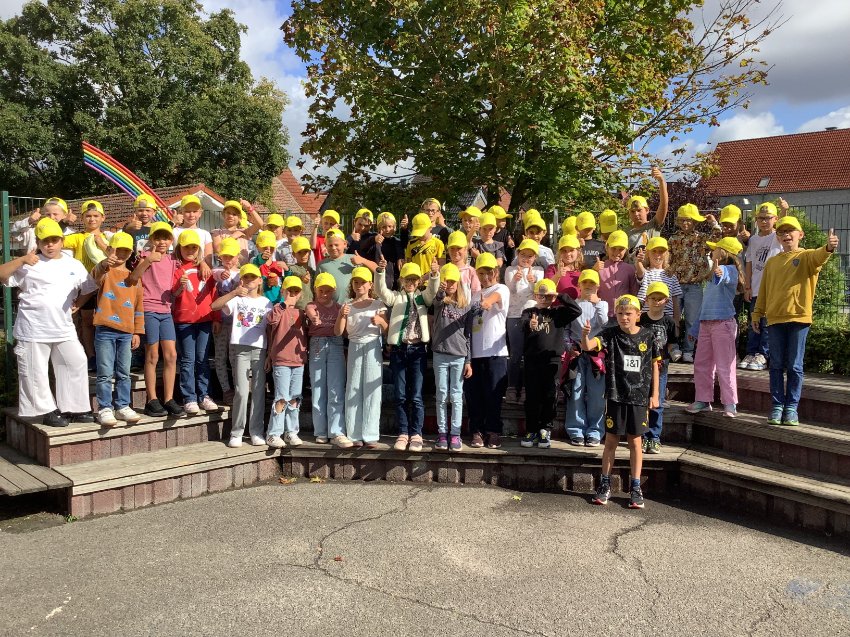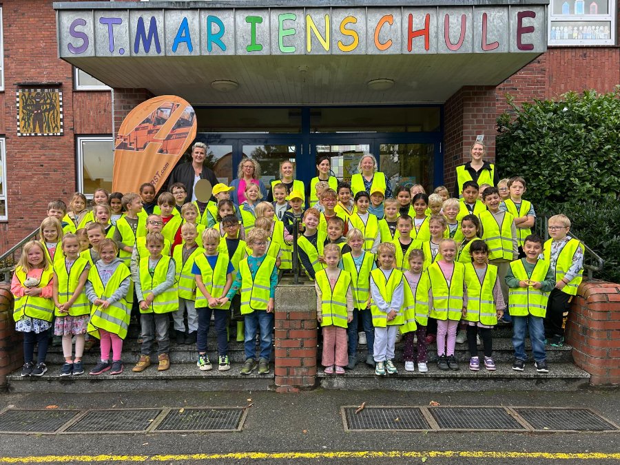 Am Donnerstag, den 11. September 2025, erhielten die Erstklässlerinnen und Erstklässler der St. Marienschule Appelhülsen von der Appelhülsener Logistik-Firma Hollenhorst neue Leuchtwesten. Damit sind nun alle Schülerinnen und Schüler der Schule mit den gelben Westen ausgestattet, die auf dem morgendlichen Schulweg für deutlich mehr Sicherheit durch Sichtbarkeit sorgen. Ergänzt wird das Konzept durch eine Unterrichtsstunde mit dem Verkehrsberater der Polizei, der den Kindern erklärt, warum helle Kleidung und umsichtiges Verhalten im Straßenverkehr so wichtig sind.
