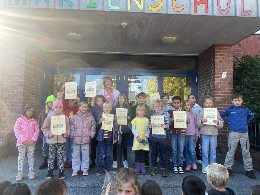 Direkt im Anschluss startete am 15. September 2025 die landesweite Aktion „Zu Fuß zur Schule“, an der die St. Marienschule zwei Wochen lang bis zum 26. September teilnahm. Jeden Morgen konnten die Kinder an einer Stempelstelle ihre persönliche Stempelkarte füllen: einen Stempel gab es für das Tragen der gelben Weste, einen weiteren für den Schulweg zu Fuß. Gezählt wurden die Stempel anschließend pro Klasse und in die Klassenurkunden eingetragen. Das Ziel der Schule war klar: weg vom Elterntaxi, dafür sichtbar, sicher und eigenständig zur Schule. Am Ende der Aktionstage nahmen die Klassensprecher diese stolz entgegen – und das Ergebnis kann sich sehen lassen: Insgesamt wurden 3555 Stempel gesammelt!