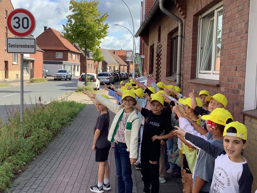Die Schülerinnen und Schüler der Klassen 3a und 3b haben sich im Rahmen der Aktion „Coesfeld sieht gelb“ intensiv mit dem Thema Verkehrssicherheit beschäftigt. Gemeinsam mit ihren Lehrerinnen und Begleitpersonen beobachteten sie den Straßenverkehr am Zebrastreifen beim Kindergarten sowie in der 30er-Zone am Altenheim in Appelhülsen.