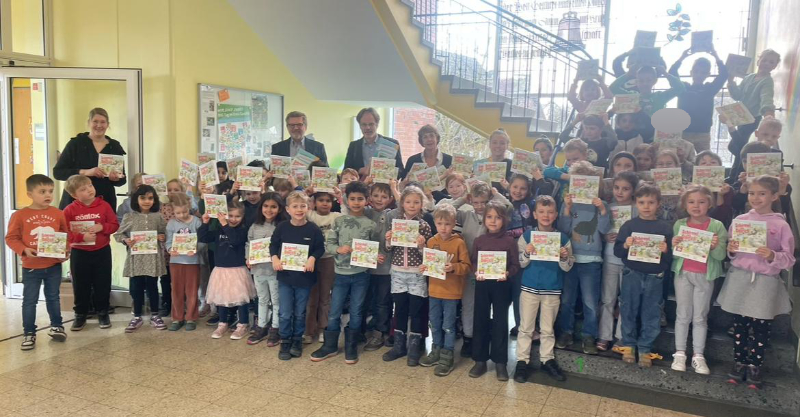 Große Freude an der St. Marienschule: Der Rotary Club Coesfeld-Baumberge, vertreten durch Ludger Jutkeit und Dr. Sascha Schönhausen, schenkte allen Erstklässlerinnen und Erstklässlern aus drei Klassen das Buch „Schirmel und Oderich“.