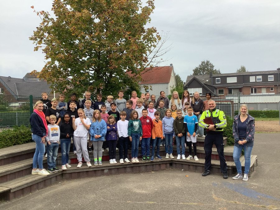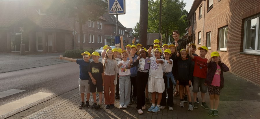 Im Rahmen der Aktion „Kreis Coesfeld sieht gelb“ gingen am Freitag, den 6.9.24, die dritten Klassen der St. Marienschule mit ihren Lehrerinnen Frau Michalek und Frau Franke durch Appelhülsen, um den Schulweg der Kinder noch sicherer zu machen. Mit der Unterstützung von Radio Kiepenkerl konnten die Kinder mit ihren gelben Käppis schon von Weitem auf sich aufmerksam machen. In diesem Jahr stand für die Kinder nicht nur das richtige Tempo und Verhalten der Autofahrer in Mittelpunkt, sondern das Thema „Verkehrsgemeinschaft“. So wurde zunächst das eigene Verhalten am Zebrastreifen und an der Ampelkreuzung geschult und reflektiert bevor dann die Fahrrad- und Autofahrer unter die Lupe genommen wurden. Mit einem „Daumen hoch“ konnten die Kinder andere Verkehrsteilnehmer loben, was sie an diesem Tag mehrfach taten und somit dem einen oder anderen ein Lächeln ins Gesicht zauberten. Das Fazit der Kinder: „Wenn alle Verkehrsteilnehmer aufeinander achten und gegenseitig Rücksicht nehmen, dann läuft’s in Appelhülsen.“