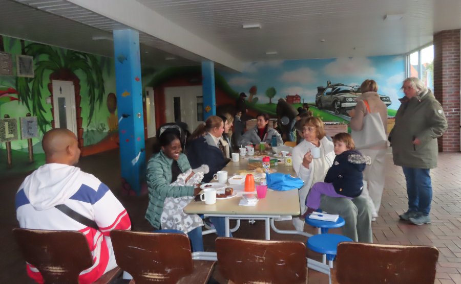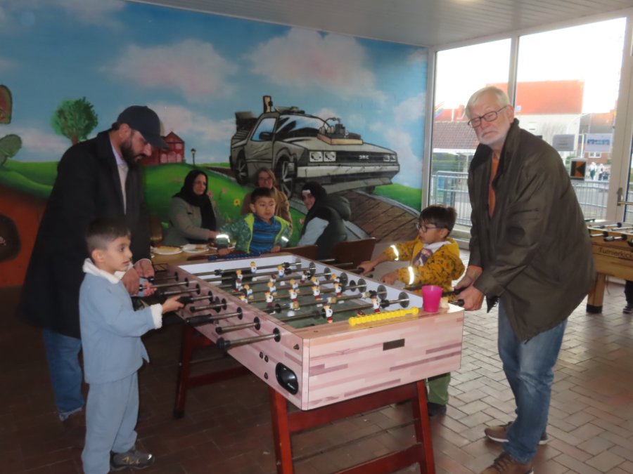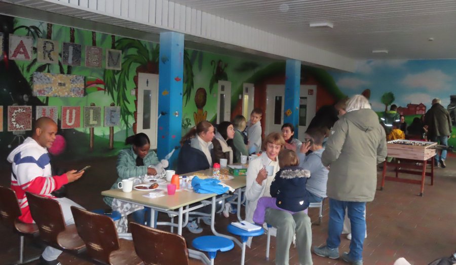 Zu einem internationalen Café an der St. Marienschule hatten sie eingeladen: Schulleiterin Angelika Wiedau-Gottwald und das Team des Flüchtlingsübergangsheims an der Bahnhofstraße 70 in Appelhülsen. Und international wurde es tatsächlich in der neu gestalteten Pausenhalle der Grundschule. Dort trafen sich mehr als 40 Gäste aus der Ukraine, Syrien, Angola, Afghanistan, Armenien und Deutschland an der langen Kaffeetafel und versuchten, über die Sprachbarrieren hinweg ins Gespräch zu kommen. Dass dies bei den Kindern am besten klappte, die sich auf dem Schulhof mit Bällen, Fahrzeugen und am Kicker sofort gemeinsam vergnügten, wunderte niemanden. Aber auch die Erwachsenen saßen in Gruppen beieinander und unterhielten sich. Dazwischen die ehrenamtlichen Helfer um Annette Hamers und Stefan Maas, die, genau wie bei ihrer täglichen ehrenamtlichen Arbeit, die Kontakte aktiv förderten. So bieten diese Helfer Unterstützung im täglichen Leben wie bei Behördengängen oder Arztbesuchen, bieten Sprachkurse an und haben Info-Broschüren mit wichtigen Adressen und Gegebenheiten in Appelhülsen in vielen Sprachen herausgegeben. Geplant ist bald ein gemeinsames Kochen mit nationalen Spezialitäten. Damit das internationale Treffen keine einmalige Aktion bleibt, bietet das Team regelmäßige Treffen im Übergangsheim an, zu dem jeder dienstags ab 15.30 Uhr eingeladen ist. Auch ist im Gespräch, einen Termin mit Jugendlichen im Panama-Treff sowie für die Kleinen im Kindergarten zu finden. Das Team sucht zudem weitere ehrenamtliche Helfer zur Unterstützung ihrer Arbeit und bittet bei Interesse um Kontaktaufnahme mit der Beauftragten für das Ehrenamt, Vanessa Kalkhoff, bei der Gemeinde Nottuln.