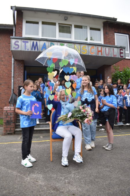 Mit einem lachenden und einem weinenden Auge wurden weitere Mitglieder der Schulgemeinschaft, fünf Lehrerinnen und drei Mitarbeiterinnen der OGS, an andere Schulen bzw. in den Mutterschutz verabschiedet. Einen ganz großen Abschied gab es für Mechthild Wantia, die nach 21 Jahren mit einem gemeinsamen, auf sie persönlich umgetexteten Lied der Schulgemeinde, in den wohlverdienten Ruhestand geschickt wurde. Eine „warme Dusche“ am Regenschirm aus vielen guten Wünschen wird sie dabei begleiten. Und zum guten Schluss bildeten alle Gäste den traditionellen Tunnel quer über den Schulhof, durch den die Viertklässler in die weite Welt entlassen wurden.
