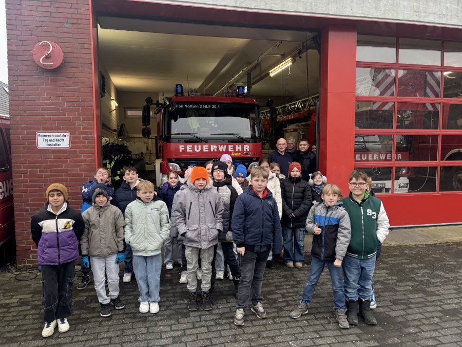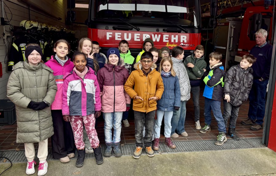 Im Rahmen der Unterrichtsreihe Feuer im Sachunterricht konnten die Kinder der Klassen 4a und 4b der freiwilligen Feuerwehr in Appelhülsen einen Besuch abstatten. Neben Informationen zur Organisation der Feuerwehr gab es auch Einblicke in die Löschfahrzeuge und das Ausrüstungsmaterial des Feuerwehrgerätehauses.