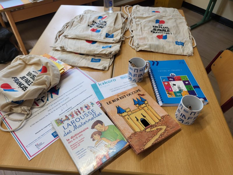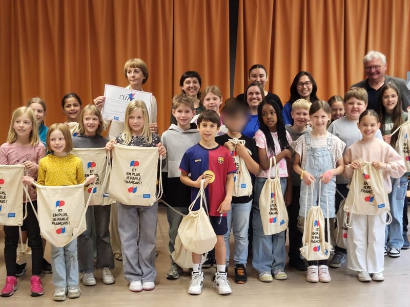 Zur Preisverleihung am Mittwoch wurde nun das Team des Institut français, Bérengère Aubineau, Referentin für Bildungsprojekte in NRW, Kaoru Filippone und Zoé Querbach, beide Lektorinnen für das France Mobil sowie Louise Gardin, Praktikantin im Büro für Sprach- und Bildungskooperation NRW, in der Marienschule von den Schülerinnen und Schülern der Französisch-AG und Schulleiterin Angelika Wiedau-Gottwald aufgeregt empfangen. Ebenfalls dabei war der Vorsitzende vom Nottulner Komitee für Städtepartnerschaft, Günter Dieker. Die kleine Feier begann mit einer Animation und Sprachspielstunde ganz auf Französisch aus dem Programm France Mobil. Mit großem Spaß wurden Tiere, Farben und Körperteile bei Bewegungsspielen gelernt und geübt, auch Satzanfänge gewürfelt und Sätze vervollständigt. Die Kinder und auch die Erwachsenen machten mit großem Spaß und hoch motiviert mit. Dann gab es für jeden erfolgreichen Quizzer eine Geschenketasche mit französischen Büchern, für die Marienschule ein Buchpaket für die Französisch-Bibliothek und, als Sonderpreis für die beste Grundschule, ein Kokoro lingua france-Abonnement für ein ganzes Jahr. Kokoro lingua ist ein motivierendes Online-Programm zum frühen Lernen von Fremdsprachen mit wöchentlichen Videos, Spielen, Liedern und weiteren Aktivitäten. Die Ehrenurkunde für die Schule wird demnächst im Flur des Schulgebäudes neben den Urkunden zu betrachten sein. „Die französischen Gäste waren ganz begeistert von der Freude unserer Kinder beim Mitmachen und auch von unserer französischen Dauerausstellung im Obergeschoss“, so Rektorin Wiedau-Gottwald nach der Feierstunde.