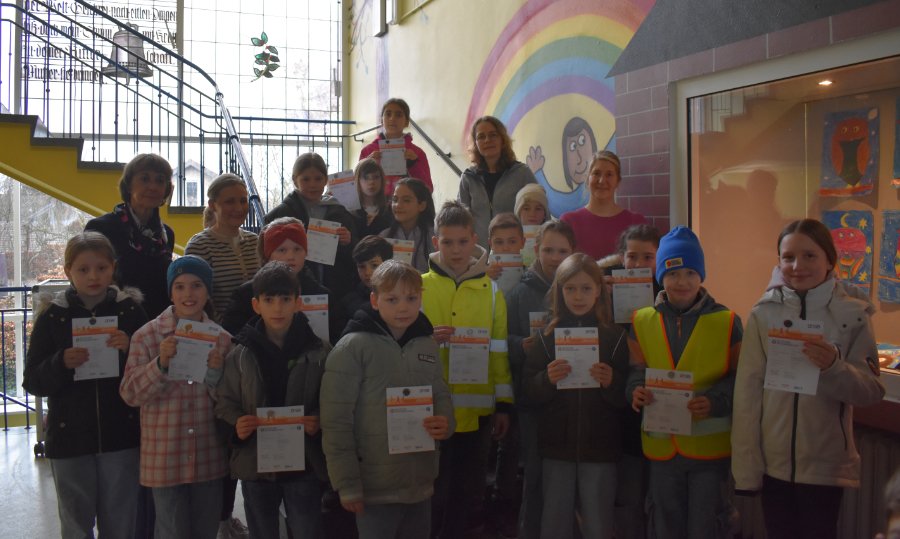 Jeden Morgen erhielten die Kinder, die sich zu Fuß auf den Weg gemacht haben, für ihre Anstrengung einen Stempel auf ihrer Stempelkarte. Aber das war noch nicht alles: Wer zusätzlich seine Warnweste trug, um im morgendlichen Straßenverkehr besser sichtbar zu sein, wurde mit einem zweiten Punkt belohnt. Die Aktion soll nicht nur Spaß machen, sondern auch die Verkehrssicherheit der Schulkinder, besonders in der dunklen Jahreszeit, erhöhen.