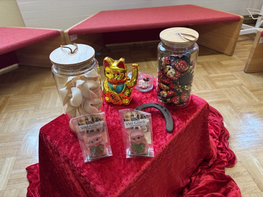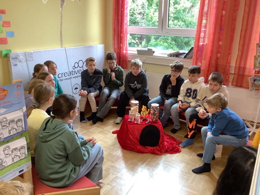Zum Welttag des Buches bekamen unsere 4. Klassen am 27. Mai ganz besonderen Besuch: Frau Heuermann von der Buchhandlung Heuermann in Coesfeld war bei uns in der Schule zu Gast. In unserer Leseoase haben wir es uns gemeinsam mit ihr gemütlich gemacht. Zum Einstieg sagte Frau Heuermann etwas ganz Wichtiges: Lesen macht glücklich – und Bücher machen glücklich! Anschließend sprachen wir zusammen über das Thema „Glück“. Frau Heuermann hatte verschiedene Glückssymbole mitgebracht: ein Schwein aus Marzipan, eine winkende Glückskatze, Glückskekse, kleine Schokomarienkäfer und Kleingeld. Gemeinsam überlegten wir, was diese Gegenstände mit Glück zu tun haben und was Glück eigentlich für jeden von uns bedeutet.