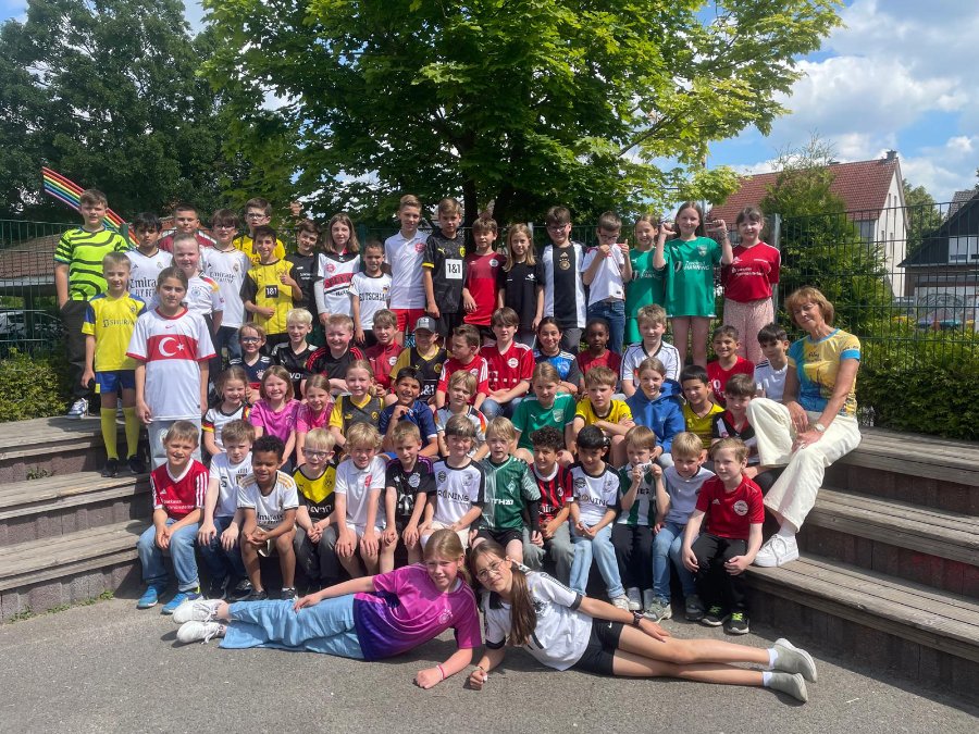 Heute war der Tag des Trikots – und viele Kinder haben mitgemacht! In bunten Trikots ihrer Lieblingsvereine kamen sie stolz zur Schule und zeigten, für welchen Sport oder Verein ihr Herz schlägt. Auf dem Pausenhof wurde natürlich auch ein Gruppenfoto gemacht – so viele verschiedene Trikots auf einmal sieht man nicht alle Tage!