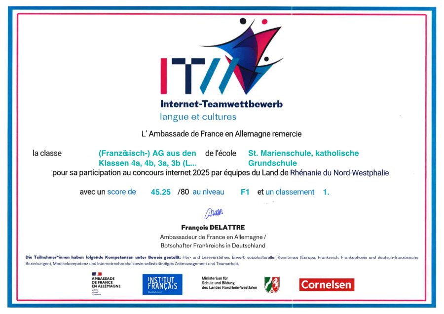 Spürbare Spannung lag in der Luft, als am Mittwochvormittag der Termin zur Preisübergabe immer näher rückte. Die Kinder der Französisch-AG der St. Marienschule Appelhülsen hatten bereits am 25. Januar am bundesweiten Internet-Teamwettbewerb „langue & culture“ des Institut francais NRW teilgenommen. Dieser Wettbewerb wird seit 2003 alljährlich im Rahmen des deutsch-französischen Tages anlässlich des Jahrestags des Elysee-Vertrags veranstaltet. Online mussten in Teams 80 Fragen, nicht nur zu Vokabeln und Grammatik, sondern auch aus acht verschiedenen Themenbereichen um aktuelle Themen wie Küche, Musik, Sport, Film, Technik aus der französischsprachigen Welt beantwortet werden. Und die fleißige wöchentliche Arbeit in der AG, frühmorgens um 7 Uhr in der 0. Stunde, mit Lehrerin Doris Evermann-Soujon hat sich gelohnt, denn Anfang Mai kam die freudige Nachricht, dass die Marienschule den 1. Preis mit 45,25 Punkten mit großem Abstand vor allen teilnehmenden Grundschulen gewonnen hat!