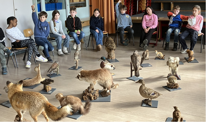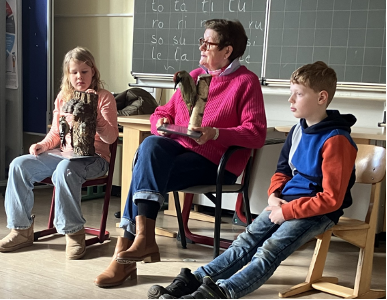 Die Schülerinnen und Schüler staunten über die mitgebrachten Tiere: Vögel wie Eulen, Spechte und sogar ein imposanter Adler waren dabei. Auch Säugetiere wie ein Fuchs, ein Rehkitz und ein Igel sorgten für große Begeisterung. Besonders spannend war es für die Kinder, einige der Tiere berühren zu dürfen und deren Fell und Federn aus nächster Nähe zu betrachten.