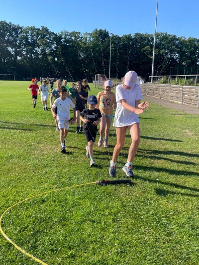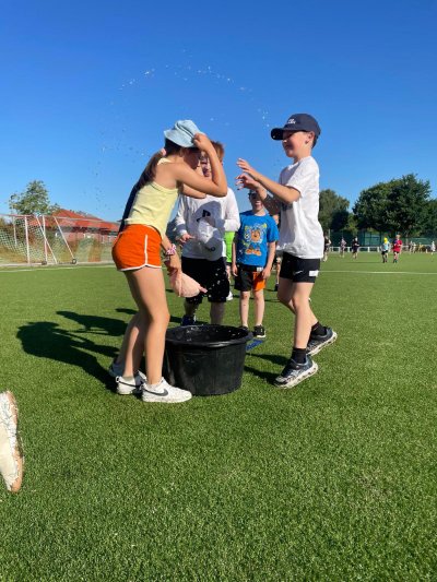 Für eine willkommene Abkühlung sorgten ein Rasensprenger auf der Laufstrecke sowie Wasserfässer, an denen sich die Kinder bei jeder Runde erfrischen konnten. Trotz der sommerlichen Anstrengung war die Stimmung hervorragend.