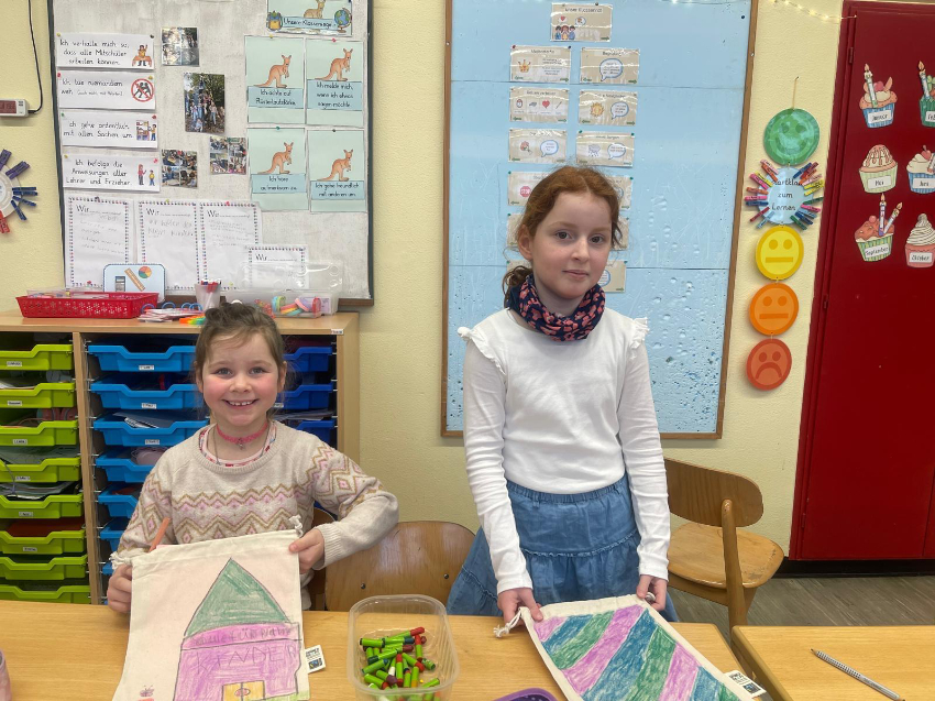 Nach der Pause stand die richtige Mülltrennung im Mittelpunkt. Die Kinder lernten die verschiedenen Mülleimer kennen und ordneten unterschiedliche Abfälle korrekt zu. Zum Abschluss gestaltete jedes Kind eine eigene Mehrwegtüte für den Einkauf, die als nachhaltige Alternative zu Plastiktüten genutzt werden kann.