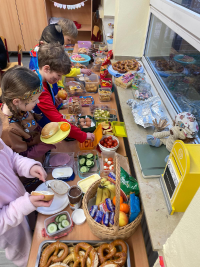 Im Laufe des Tages wurde in den Klassen gemeinsam gefrühstückt. Jedes Kind hatte etwas für das Buffet mitgebracht, sodass eine große und vielfältige Auswahl entstand. Neben Brötchen, Obst, Muffins und anderen Leckereien durften an diesem besonderen Tag auch Süßigkeiten nicht fehlen – für die Kinder natürlich etwas ganz Besonderes.