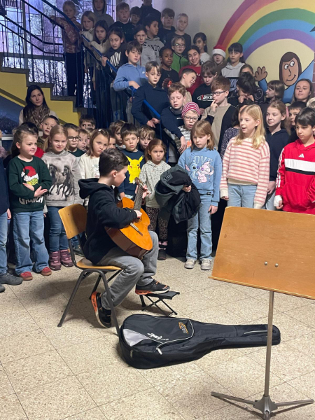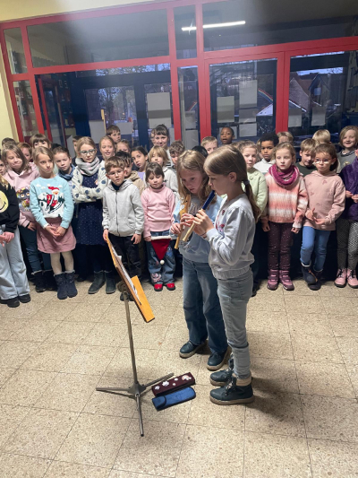 In der Adventszeit stimmte sich die Schulgemeinschaft gemeinsam auf Weihnachten ein. Jeden Montag trafen sich alle Schülerinnen und Schüler sowie die gesamten Lehrkräfte zum gemeinschaftlichen Adventssingen. Einige Klassen und auch einzelne Kinder hatten zudem weihnachtliche Beiträge vorbereitet. Es wurden Gedichte vorgetragen und Musikstücke auf verschiedenen Instrumenten vorgeführt. „Dicke rote Kerzen“ und „Die Weihnachtsbäckerei“ schallten an allen drei Terminen laut durch das Schulgebäude.