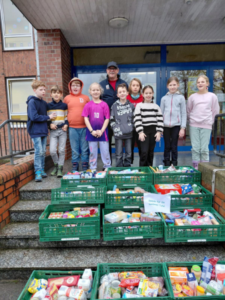 Als die Aktion endete, trugen die Kinder der vierten Klasse gemeinsam mit Frau Franke prall gefüllte Kisten zum Transporter der Tafel, wo Mitarbeiter Karl-Heinz Focke die Spenden dankbar entgegennahm. Die gesammelten Artikel kommen nun den bedürftigen Familien in Senden und Umgebung zugute und werden auch die diesjährigen Weihnachtsteller bereichern.