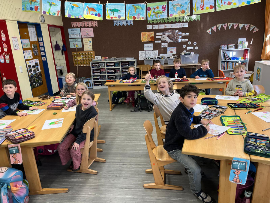Auf dem Schulhof wurden die Erstklässler von allen anderen Kindern der Schule mit einem bunten Spalier empfangen. Anschließend erlebten die Kinder ihre erste Unterrichtsstunde. Sie hörten die Geschichte von Leo, dem Löwen, der Angst vor der Schule hatte – bis er merkte, dass jedes Tierkind schon etwas Besonderes konnte, auch er. Auch unsere Erstklässler überlegten, was sie schon alles können, und hielten ihre Ideen in Bildern fest. Zum Abschluss gab es ein kleines Geschenk von den Klassenlehrerinnen.