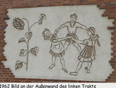 Der Entwurf des Bildes an der Außenwand stammt vom hiesigen Künstler Franz Rhode und wurde von Heinz Thieme ausgeführt. Es war “gedacht als Symbol des Lebens, das im Innern des Hauses herrschen muß, wenn der hier beeinflußte junge Mensch unter guten Vorzeichen der Gesellschaft zuwachsen soll: Aufrecht und dem Licht zugewandt wie die Sonnenblume.”(Quelle: MZ 18.08.1962)
